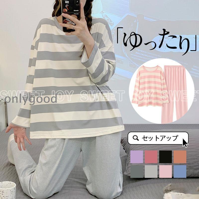 パジャマ レディース ルームウェア セットアップ 上下セット 長袖 ストライプ 通気 Tシャツ ゆったり 春秋 薄手 寝間着 部屋着 長ズボン ナイトウェア