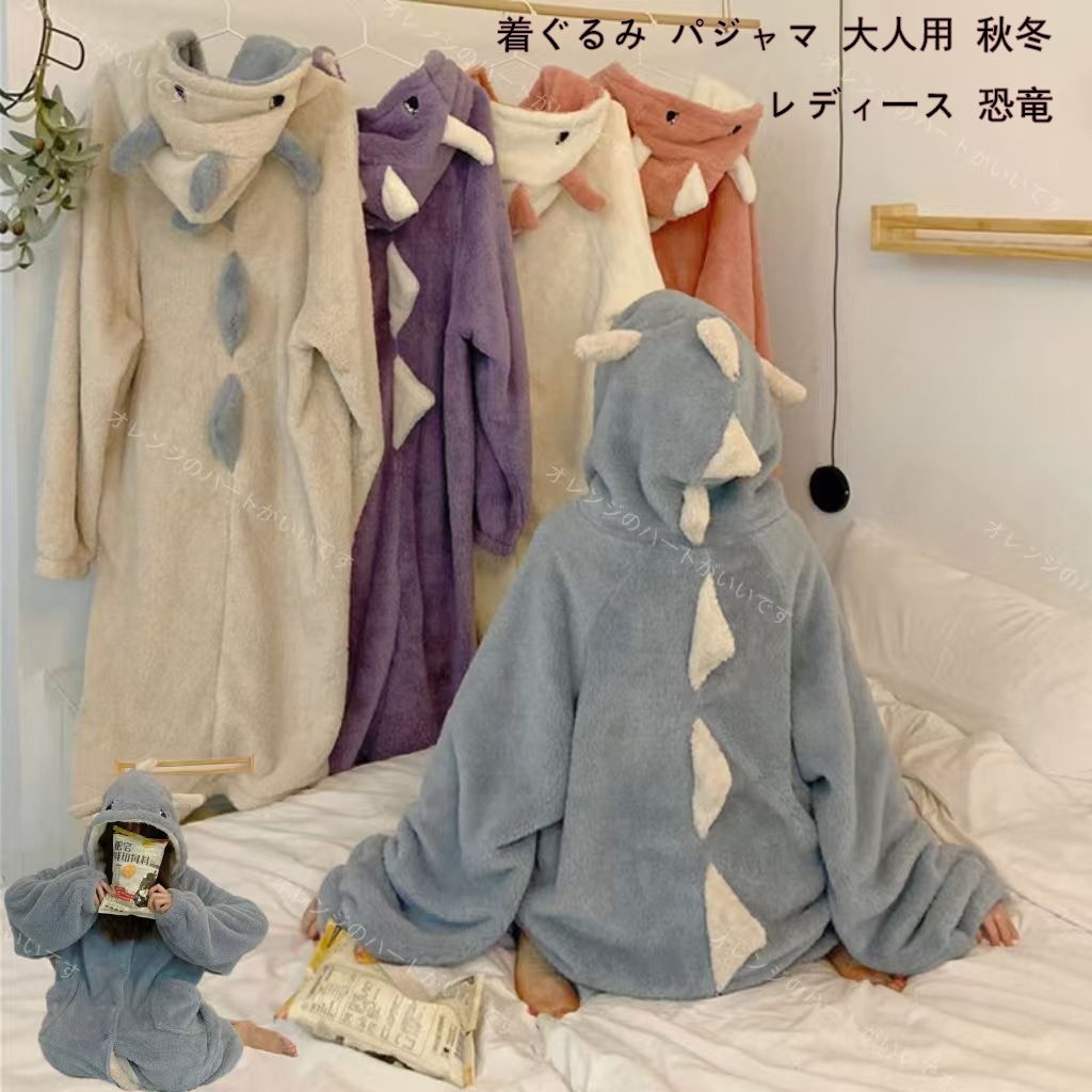 着ぐるみ パジャマ 大人用 春秋 レディース 恐竜 パジャマ モコモコ パジャマ ワンピース 動物 暖かい ルームウェア 可愛い 女子会 冬用 寝巻き ガウン 韓国 着ぐるみ風 前開き 着る毛布 フー