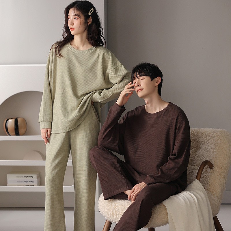 ルームウェア韓国ファッション 秋冬 シンプル カップル セット 丸ネック ワッフルチェック パジャマ 部屋着寝間 長袖ルームウェア カジュアル長袖 保温 ルームウェア セットアップ