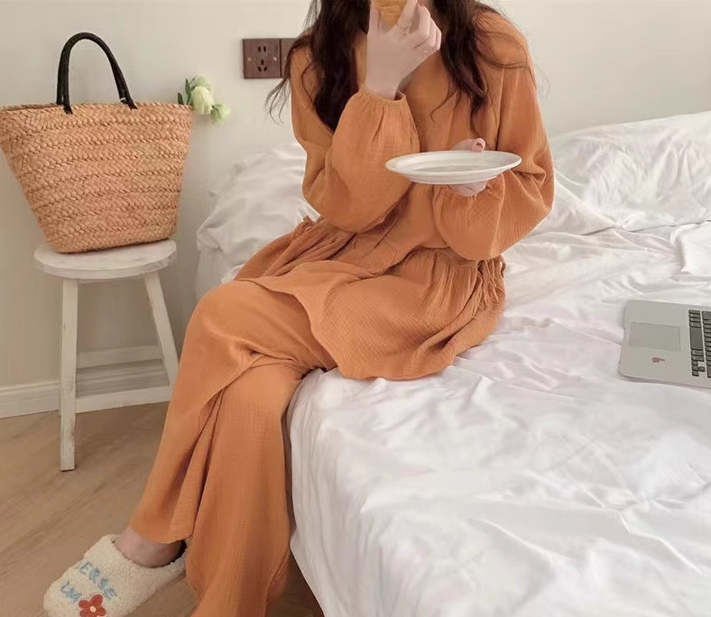 パジャマ レディース 春秋 長袖パンツ 新作 無地 シンプル コットン ガーゼスーツ ホームウェア パジャマ