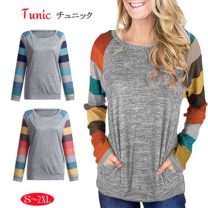 チュニック モードカラー袖 モードカラー 長袖 ボーダー柄袖 薄手 ブルー マスタード 大人 カジュ トレーナー