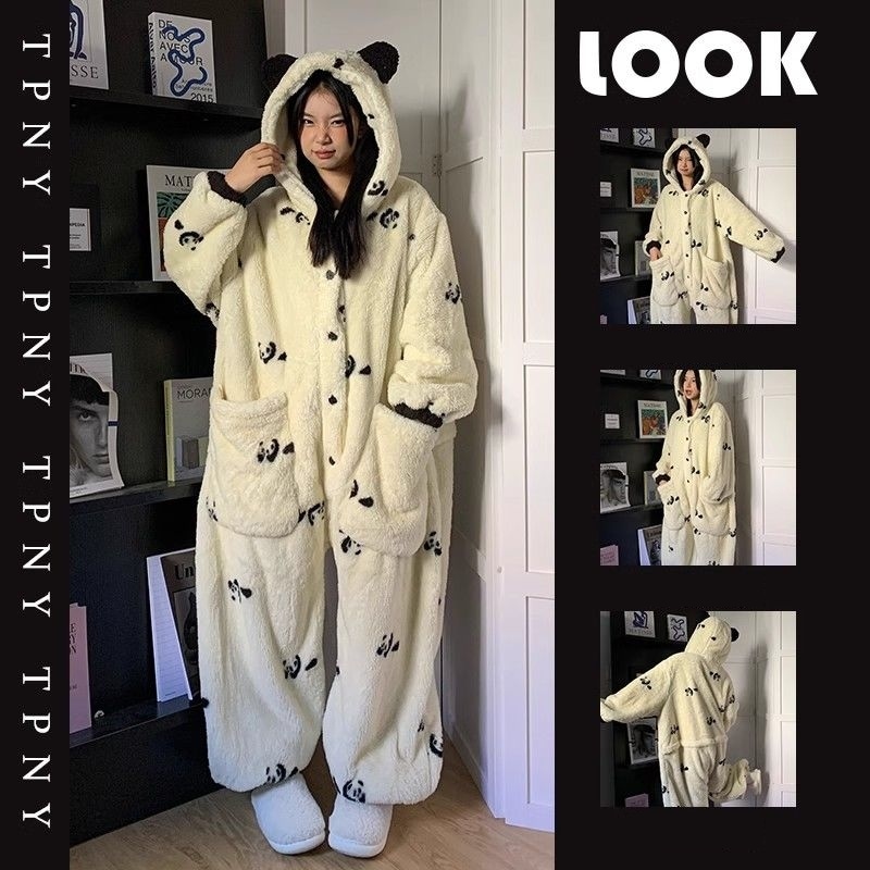 オールインワン パジャマ アウター 秋 冬 厚手 パンダ 着ぐるみパジャマ 可愛い もこもこパジャマ ルームウェア パジャマセット 韓国ファッション