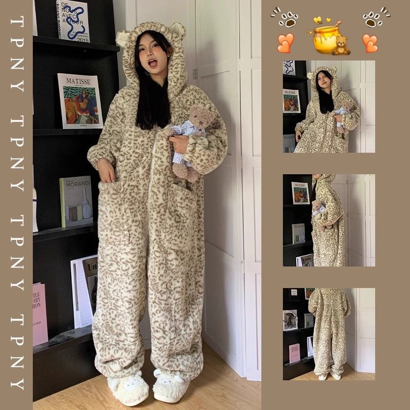 オールインワン パジャマ セット アウター 秋 冬 厚手 セット 豹柄 もこもこパジャマ ルームウェア パジャマセット 着ぐるみパジャマ 韓国ファッション