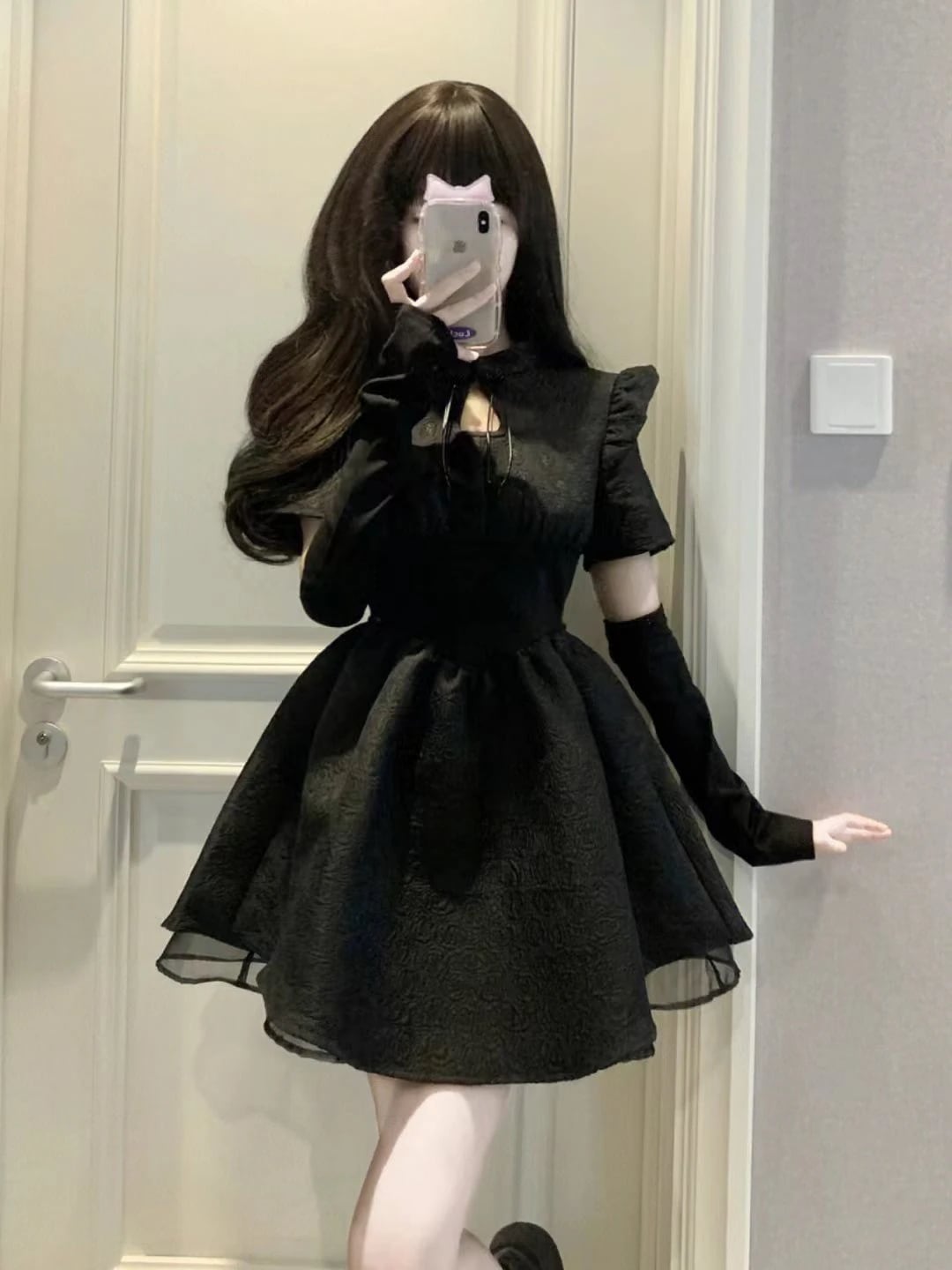 コスプレ ハロウィン 大人気ロリスーツドレス パーティードレス黒スカートフレンチ高級感ウエストを収めたスリム透かしスリーブギャル春ワンピース女コスプレドレス メイド服 メガ割