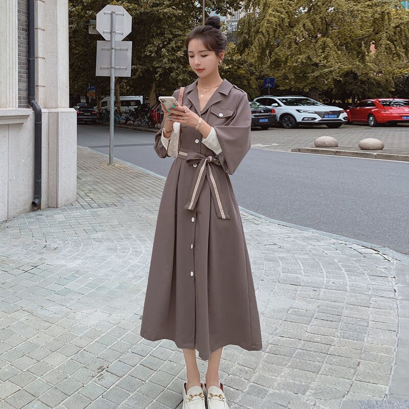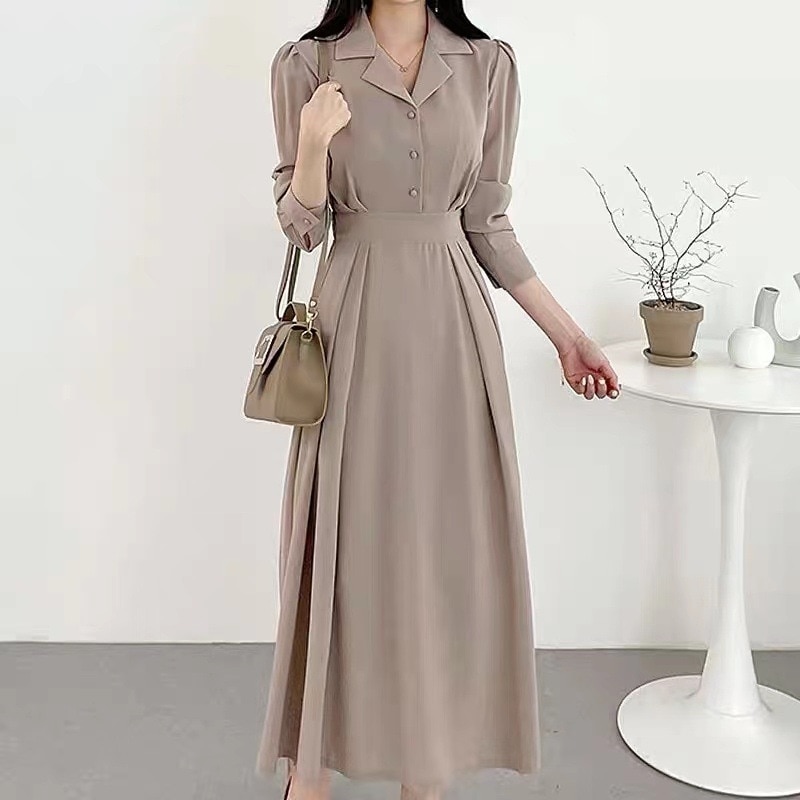 韓国ファッションロングワンピース 2024春 新作 ウエスト引き締め 開襟 ワンピース バブル袖 愛されドッキングワンピース着痩せ シャツワンピース 百掛け