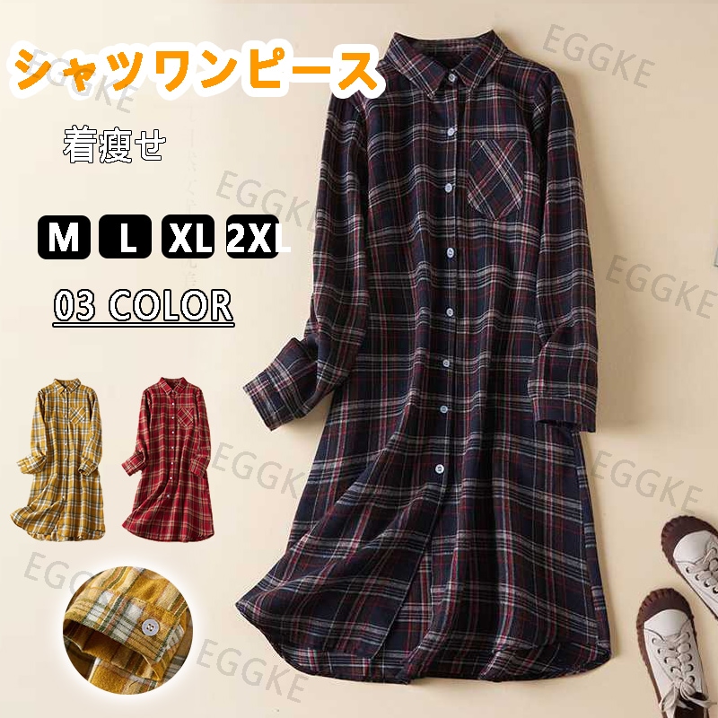 シャツワンピース 秋 レディース 長袖 タータンチェック ワンピース ワンピ ミモレ シャツワンピ チュニックワンピース ロングシャツ フェミニン おしゃれ 大人かわいい 着瘦せ カジュアル 秋