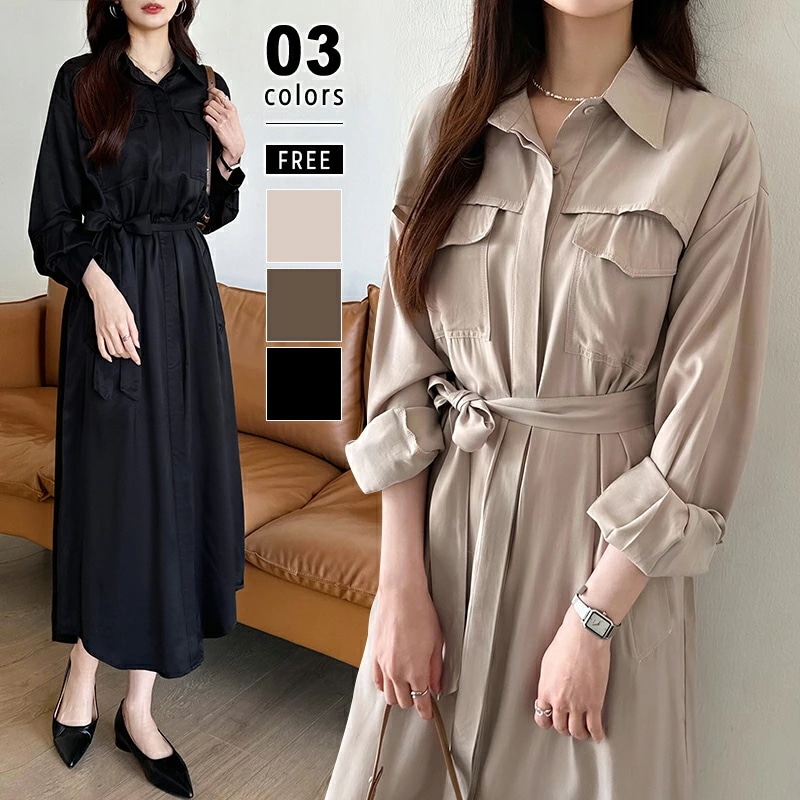 シャツワンピース きれいめワンピース オフィスカジュアル ワンピース オフィス セレモニー 長袖 サテン ロング レディース ロングワンピース ウエストマーク