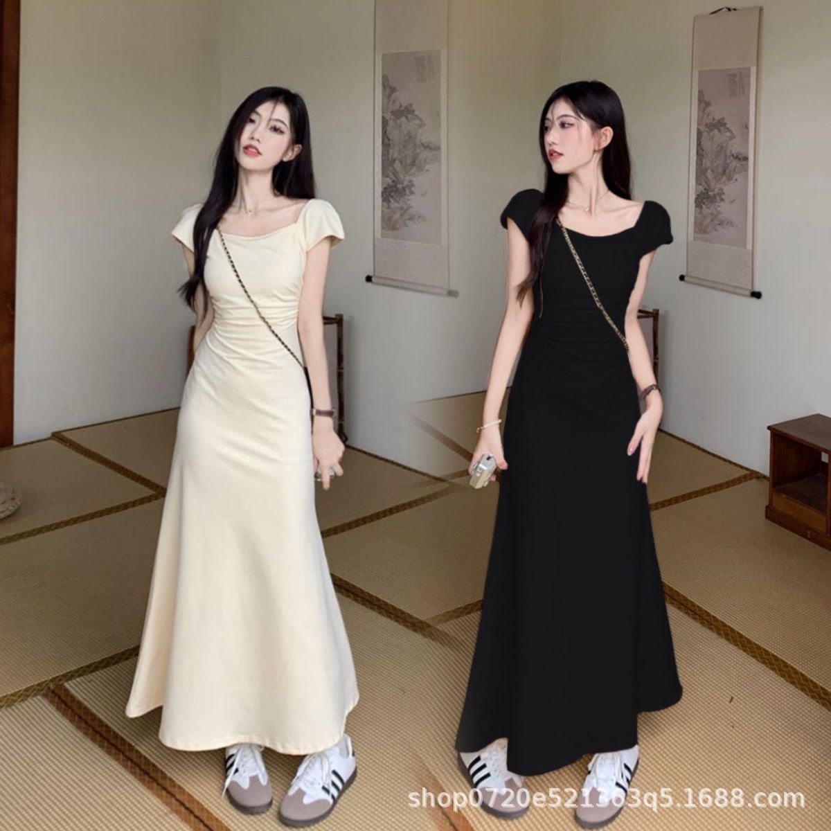 ドレス夏2025新しいピンチウエスト薄いフレンチスクエアネックロングドレス妖精の気質優しい風 シフォンワンピ