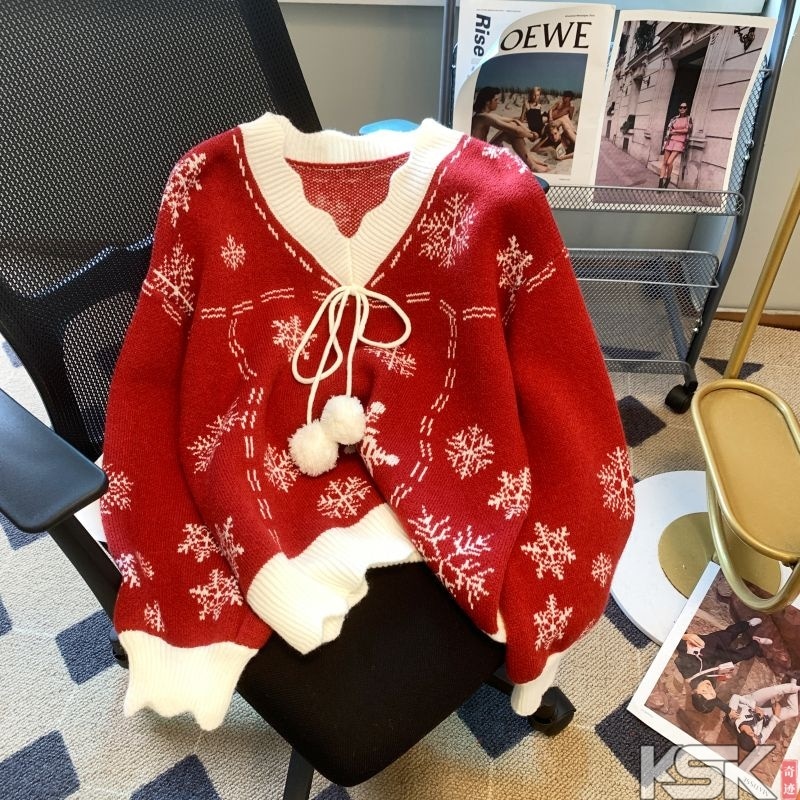 2025クリスマス新型赤い秋冬セーター雪花けだるいニット厚手ゆったりしたコート甘くて暖かい長袖上着潮 クリスマス