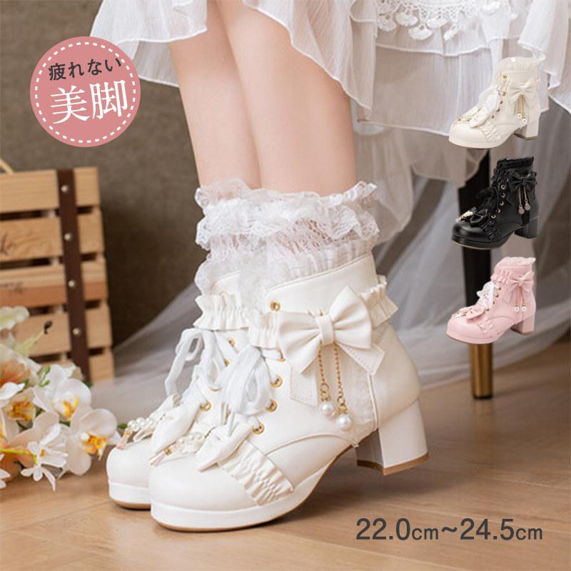 ロリータシューズ 革靴 レディース ロリータ 靴 姫系 ラウンドトゥ ハイヒール パンプス アンクルブーツ パール飾り リボン 可愛い お嬢様風