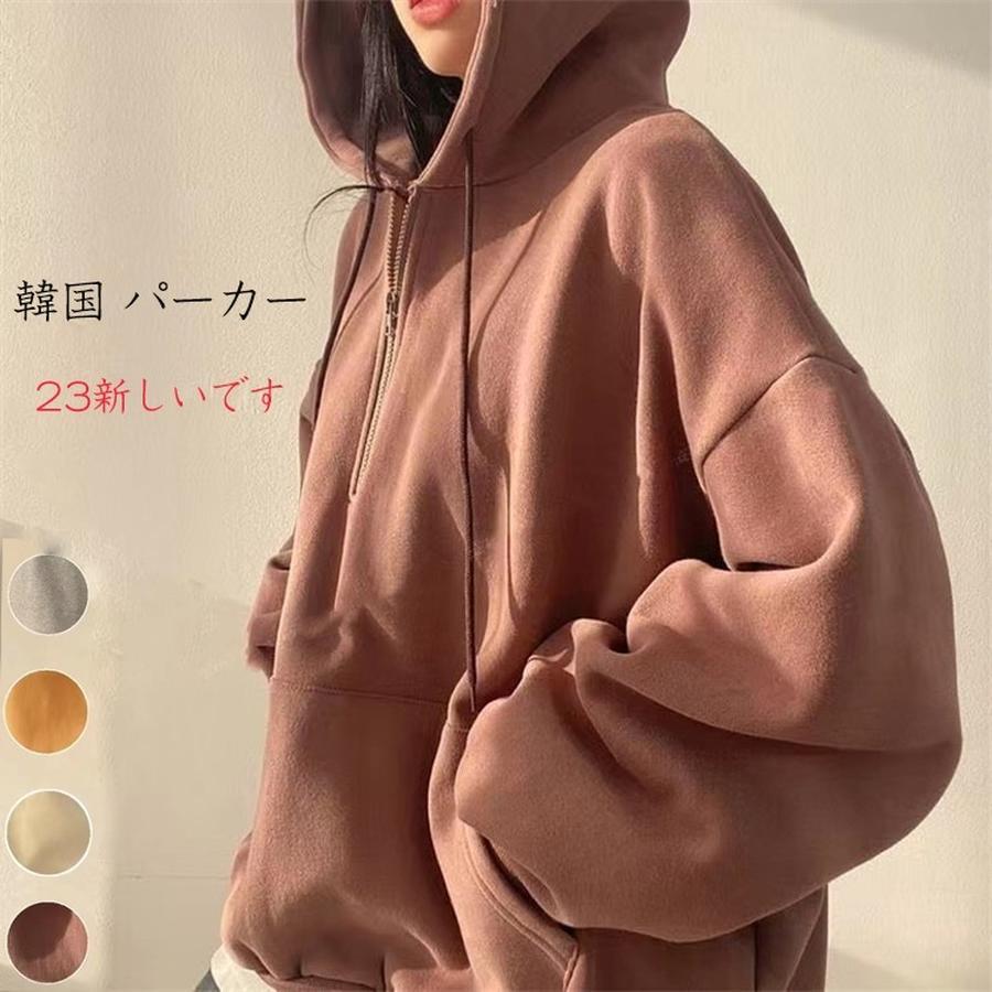 韓国 パーカー純粋な色 ハーフジップ裏起毛パーカー 2023新モデル 韓国ファッション女子 スーパーきれいな秋冬 カジュアルな衛衣 厚い 帽子付パーカー レディーストップス