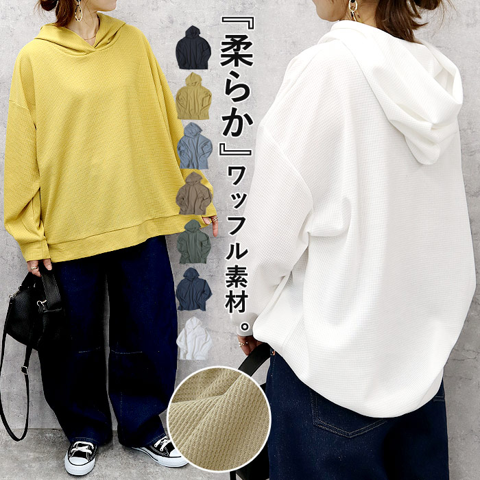 レディース 長袖 秋 冬 黒 白 おしゃれ パーカー トップス ワッフル 袖リブ スリット ゆったり[郵3]^t1079^ パーカー