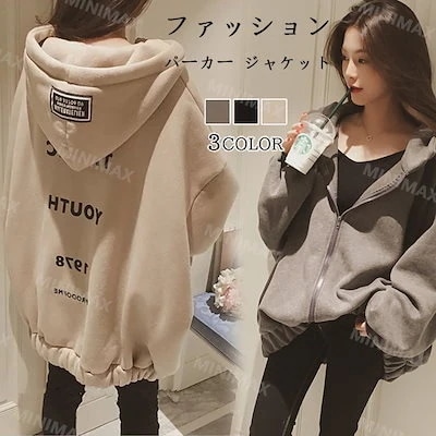 パーカー レディース 韓国 オーバーサイズ 春秋 チュニック 前開き ゆったり ジップアップ アウター 羽織り 長袖 フード カジュアル スポーツ