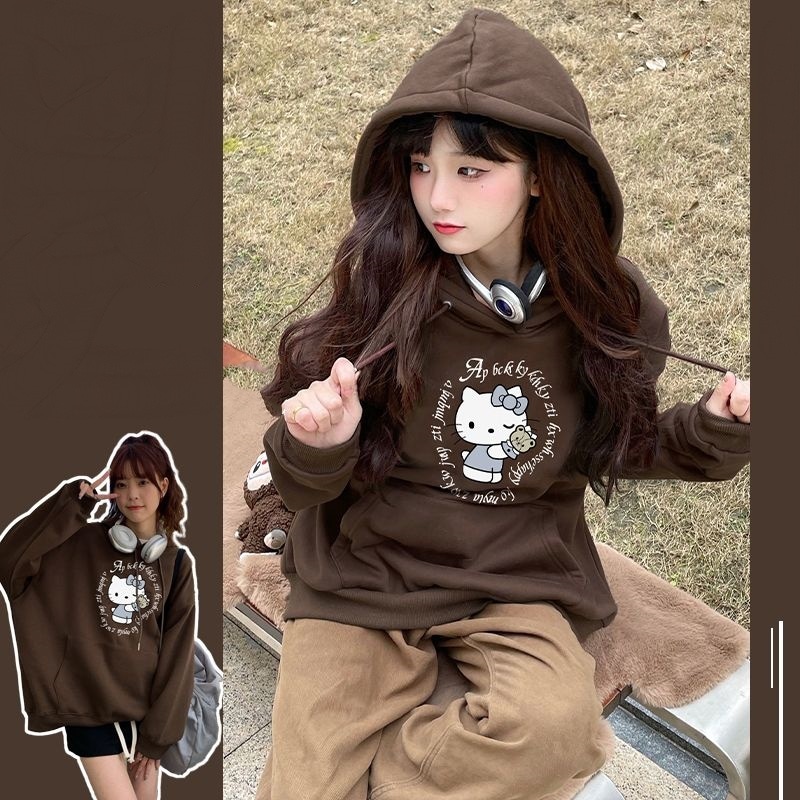秋冬 怠惰な風 レディース ハローキティ プリント ファッション フード付きパーカー カジュアル ゆったり 新しい ジャージ パーカー