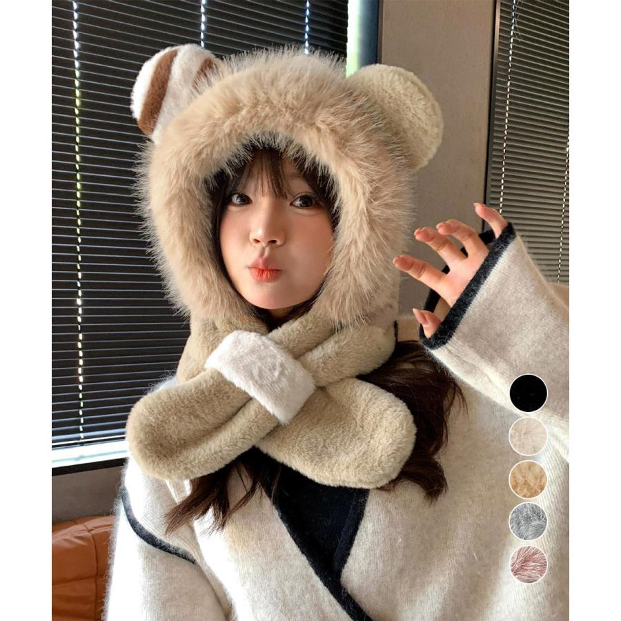 人气 新作 くまみみ帽子 マフラー付きファー帽子暖か スヌード