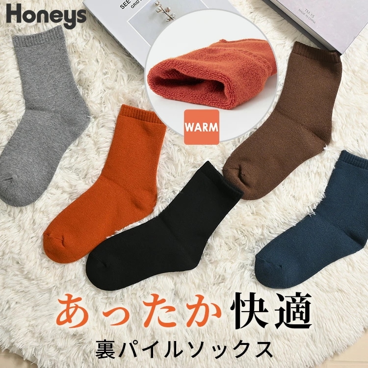 Honeys 裏パイルクルー丈ソックス ソックス 靴下 クルー丈 パイル素材 綿混 無地 シンプル 冬 黒 靴下