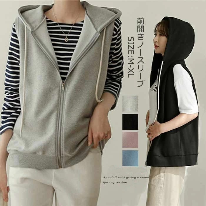 ベスト パーカー 秋物 レディース 秋 前開き トップス フード付き 春 秋冬 ジップアップ パーカーベスト ノースリーブ ゆったり カットソーベスト 重ね着 レイヤード スウェット アウター お洒落