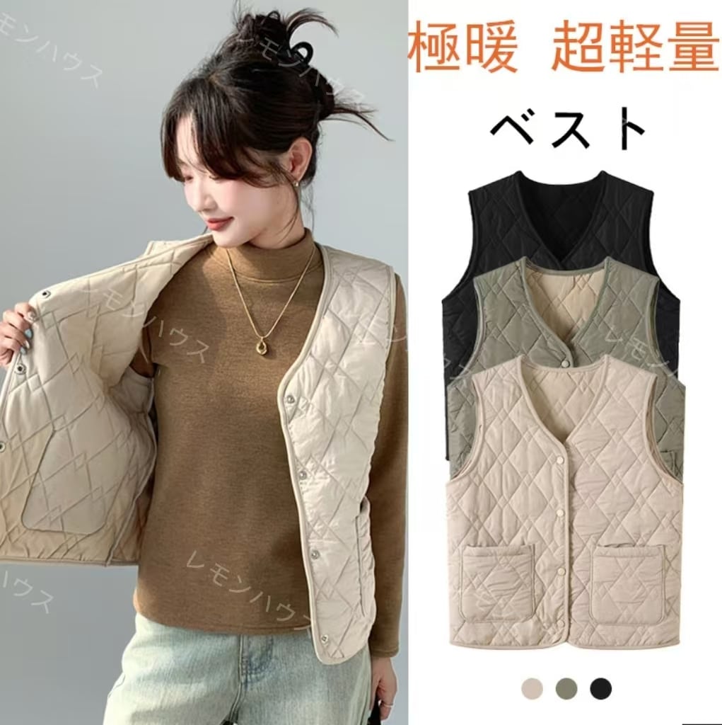 秋冬 超軽量 ベスト レディース アウター冬 極暖裹起毛 中綿 ジャケット 付ボタン ベスト L-3XL大きいサイズ シンプル百掛け無地 トップス 休闲 防寒暖かい