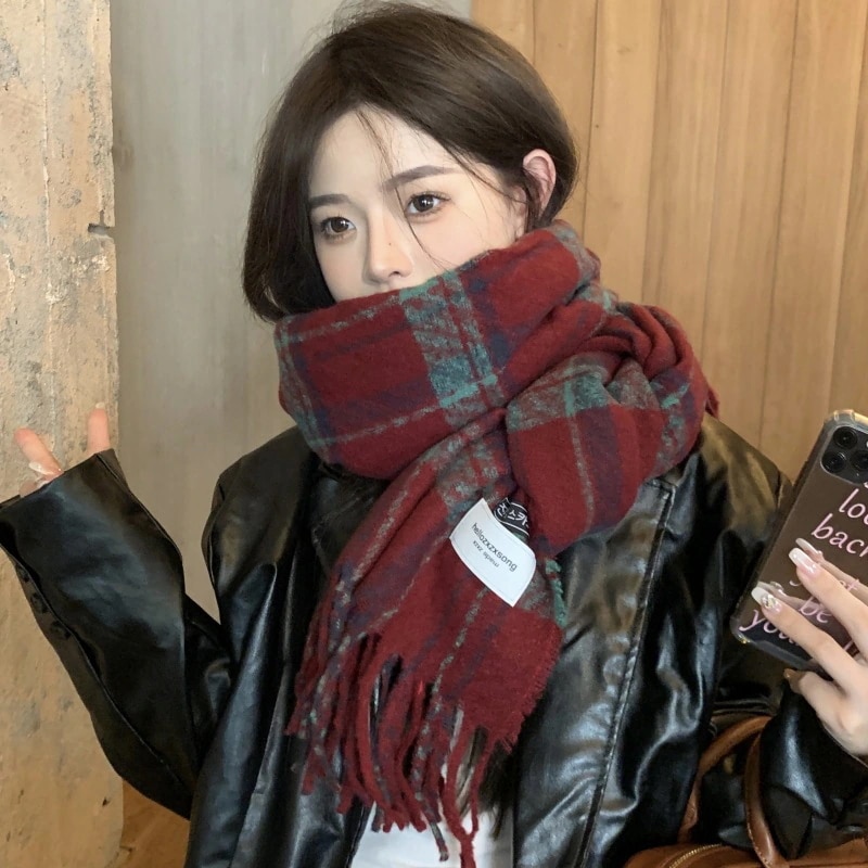 2024 人気 新作フリンジレッドのレトロなチェックスカーフ冬の暖かさ百合高級感ストール学生カップル マフラー
