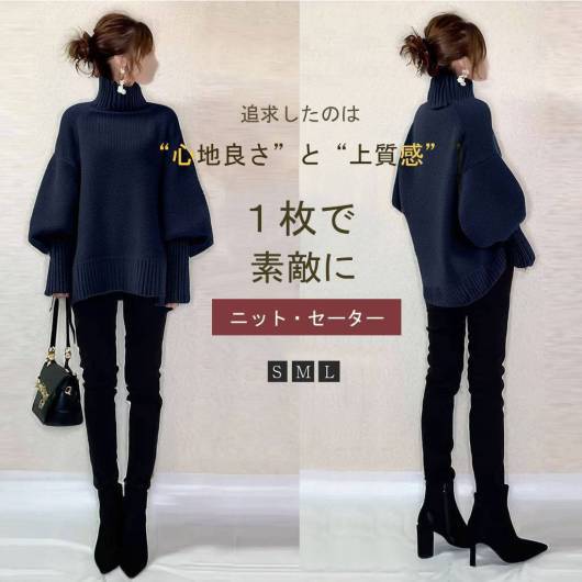 ニット セーター レディース タートルネック ハイネック プルオーバー セーター 長袖 リブニット トップス ドロップショルダー 暖かい ゆったり シンプル ゆるシルエット 防寒 厚手 チュニック 着