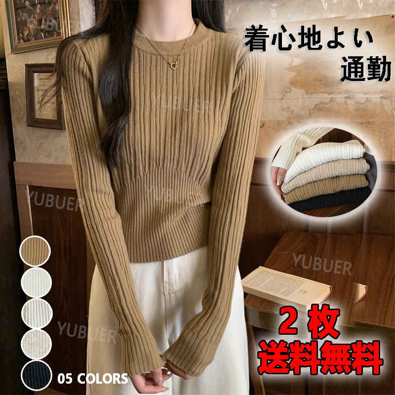 韓国ファッション秋冬人気なリブニットシンプルカシミヤタッチ ニットセーター 百掛けトップス ニットインナー ベーシックニットゆったりスウェット 長袖 リブニット