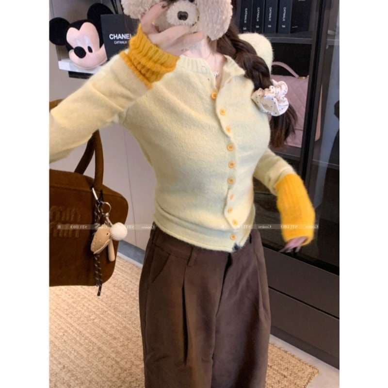 人気なリブニット 色の衝突ニットカーディガン女性冬怠惰な風の底短い段落トップス ニット