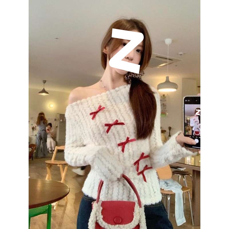 人気なリブニット 蝶結びストラップレスホワイト長袖ニット女性冬のトップス ニット