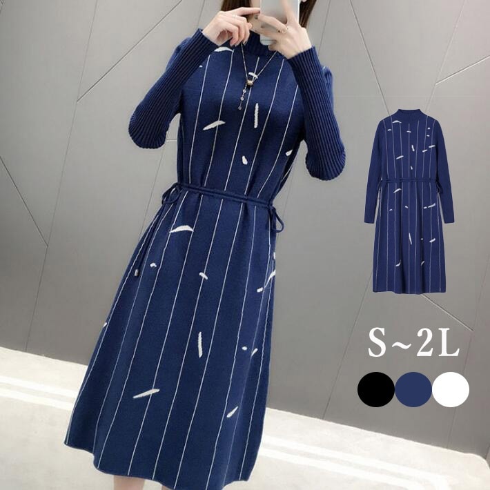 ニットワンピースワンピースニットセーター ニットワンピ リブニットウエスト紐ロングワンピロング ミディアム膝丈ハイネック 伸縮 ストレッチ 無地 長袖 秋冬S M L 2L