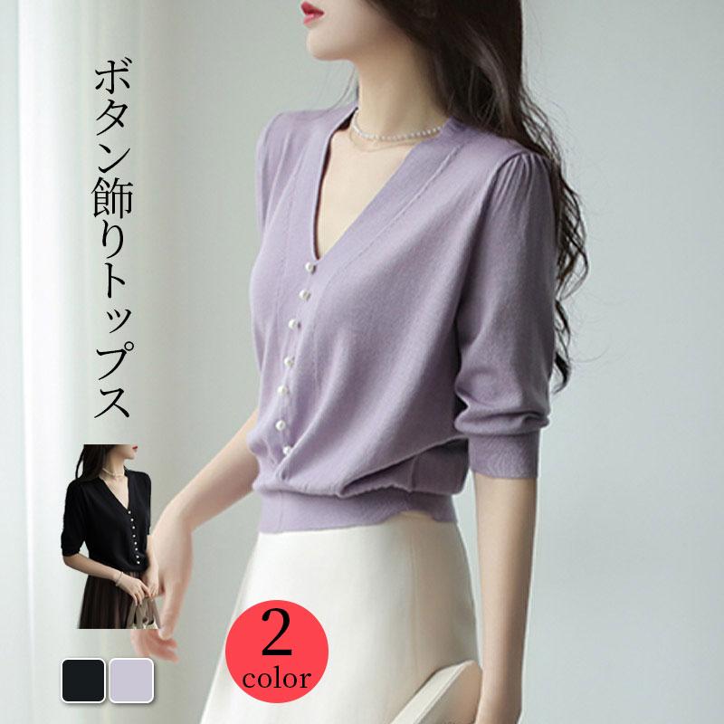 サマーニット 半袖 Tシャツ レディース Vネック トップス サマーセーター ゴルフウェア 無地 春夏 きれいめ オフィス 洗える ニット
