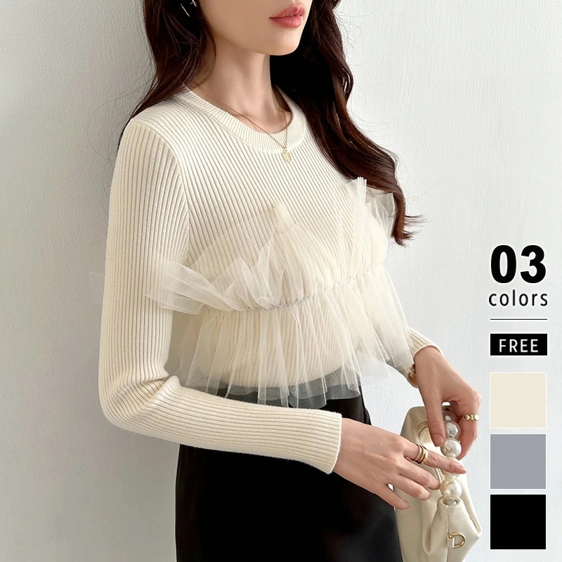 チュールドッキングニット ビスチェ風 リブニット チュール ドッキング ニット トップス レディース 長袖 フリル ドッキングニット クルーネック 異素材