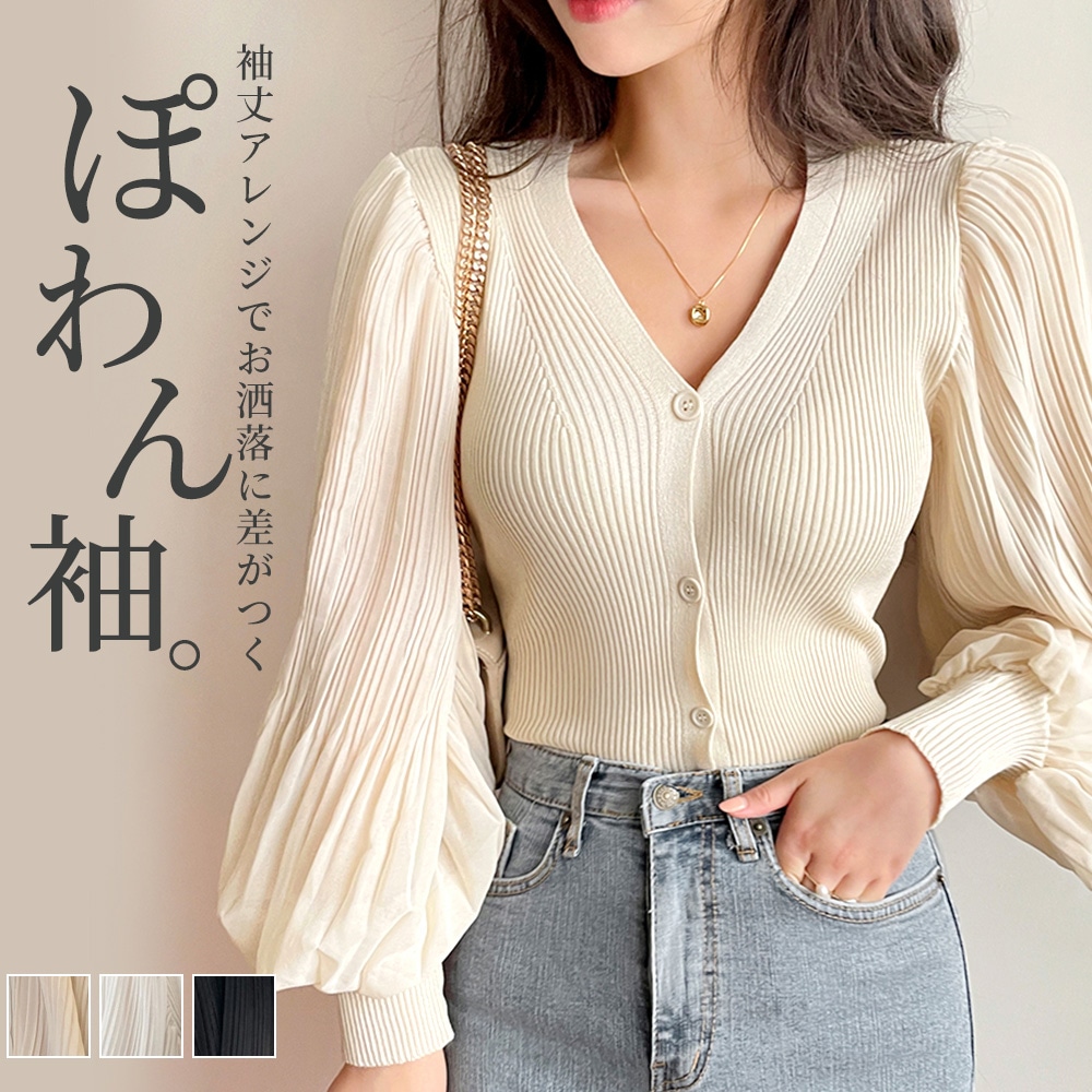 春 秋 長袖 ブラウス ニット ドッキング トップス レディース 切り替え シアー袖 ボリューム袖 レイヤード風 重ね着風 ニットトップス プルオーバー 薄手 ボタン