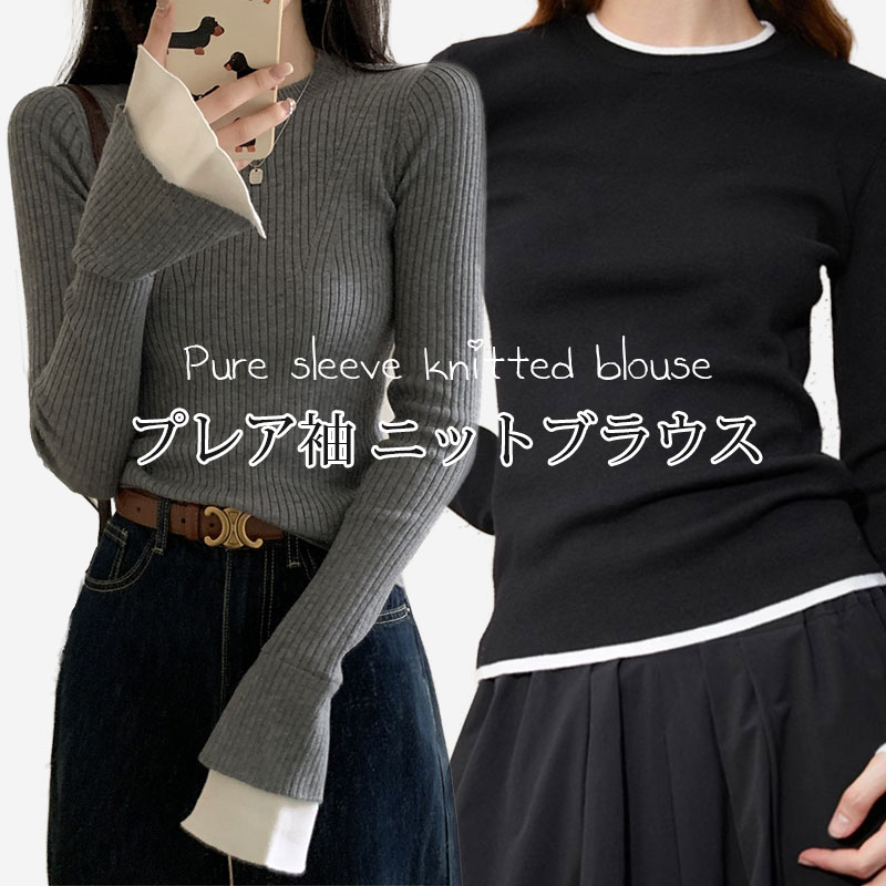 トップス ニット リブニット レディース 長袖 フレア袖 ニットセーター 秋 フレアスリーブ Uネック ラウンドネック プルオーバー 着痩せ 華奢見え きれいめ シンプル 暖かい 柔らかい 20代
