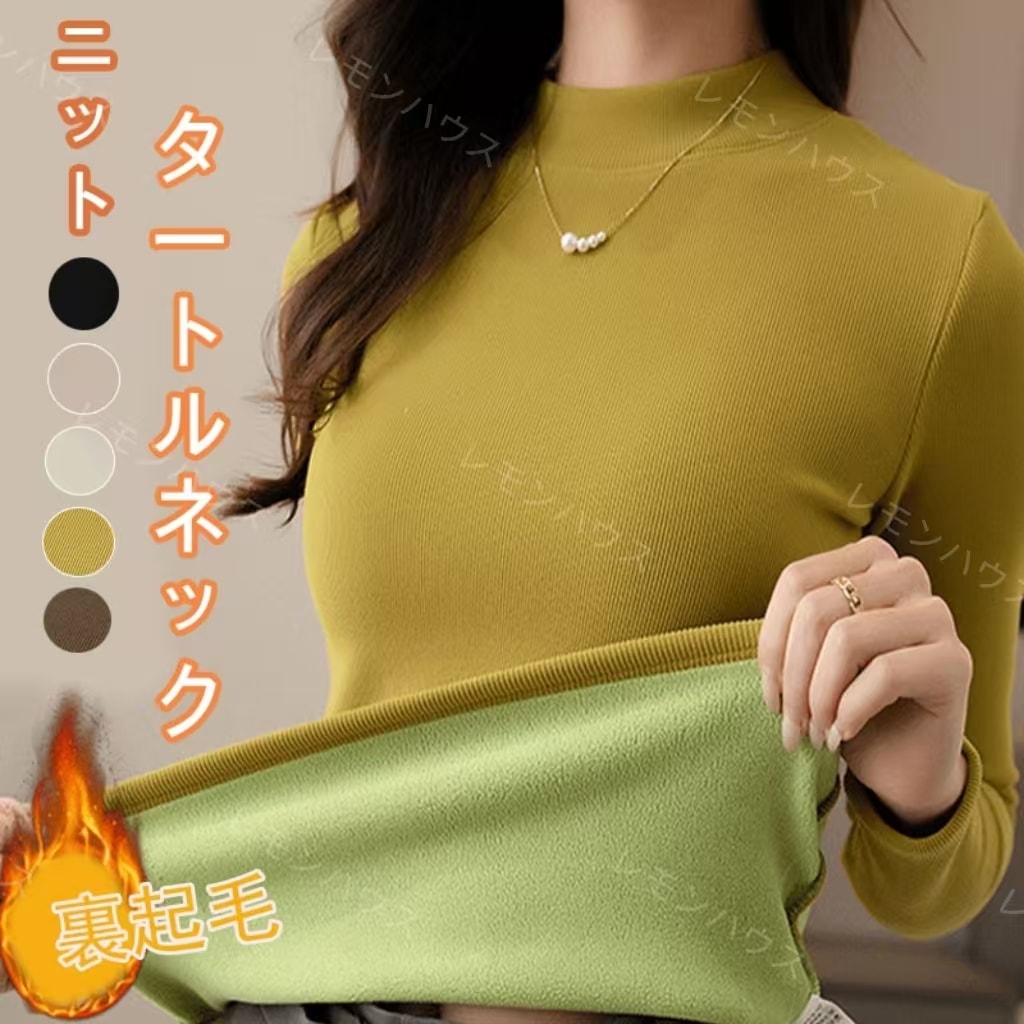 裏起毛 タートルネック ニット レディース トップス 秋冬 長袖 リブ袖 カットソー インナー シンプル フィット 暖かい 厚手 防寒 起毛