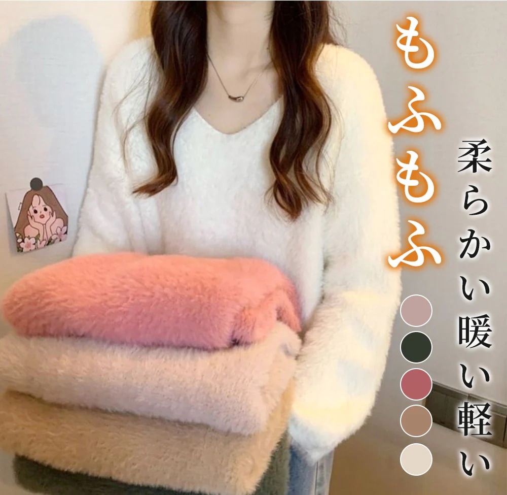 シャギーニットトップス ゆったり 長袖 Tシャツ レディース ボアトップス Vネック 大きいサイズ オーバーサイズ 防寒 保温 暖かい もこもこ オシャレ 無地 長袖トップス 韓国ファッション