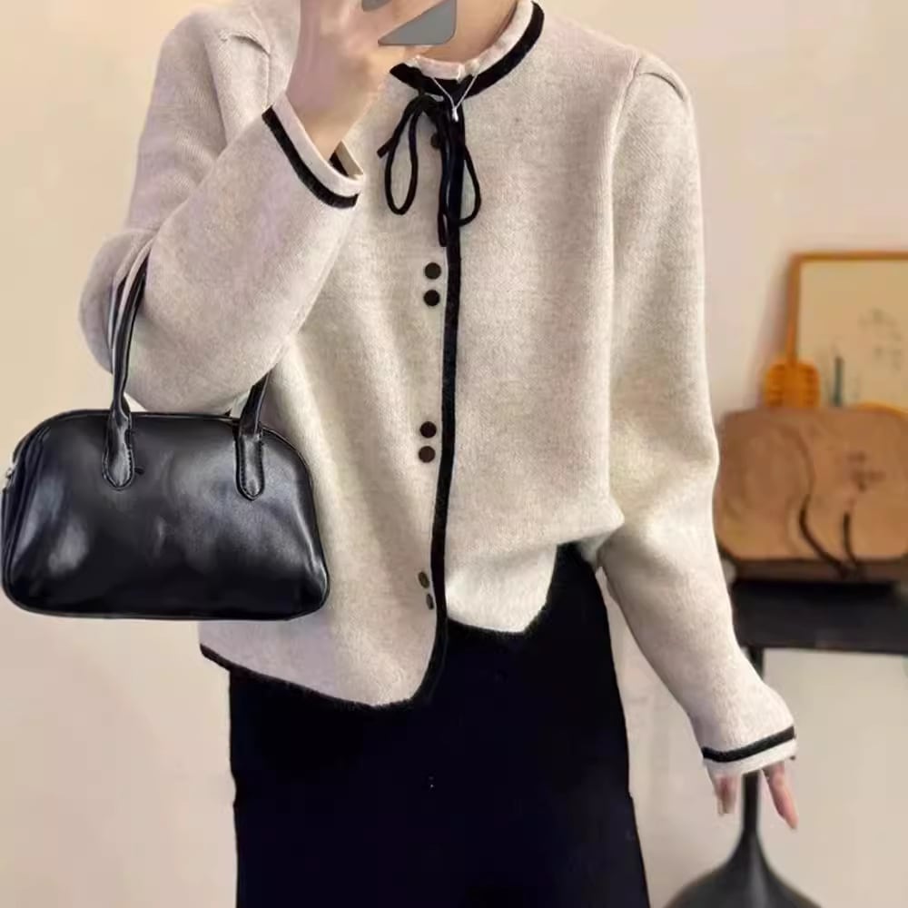 襟ぐりにリボンをあしらったアライグマのダウンセーター秋冬の新作小香風ニットカーディガンふわふわトップス女 ニット