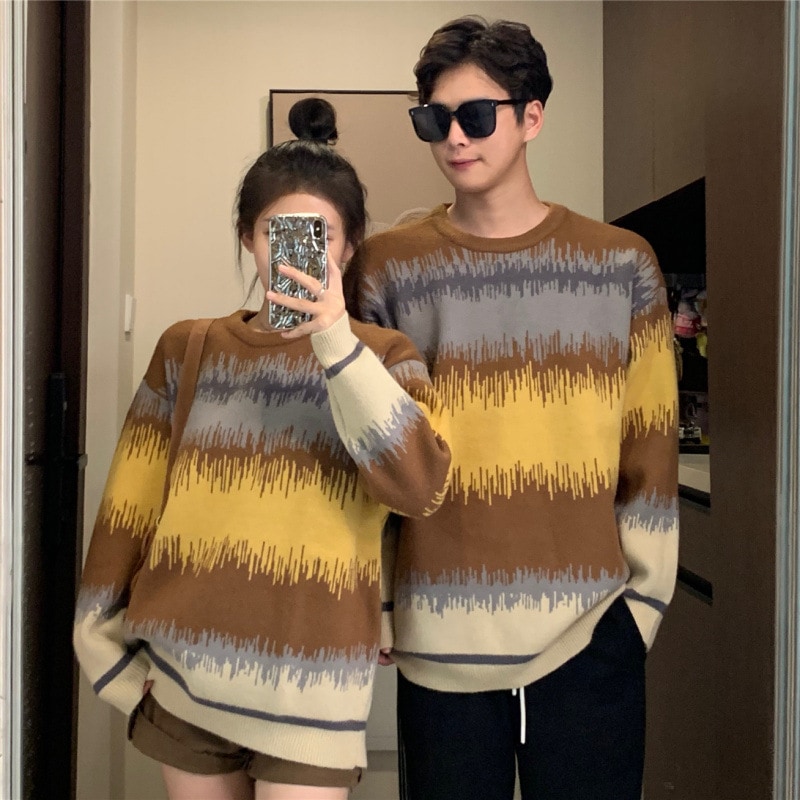 新年のペアルックセーター 丸首のセーター クリスマスパーティー厚手セーター 男性用セーター 婦人用セーター カジュアル 快適 通勤 甘い 文芸気質 長袖 しま模様 プルオーバーニットSYZ32