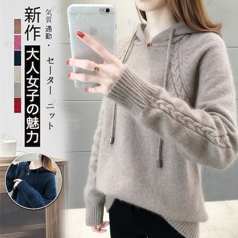 ニットセーター レディース 秋冬 40代 長袖トップス 無地ニットトップス フート連れスウェットニット ショット丈 プルオーバー ゆったりセーター カジュアル オシャレ