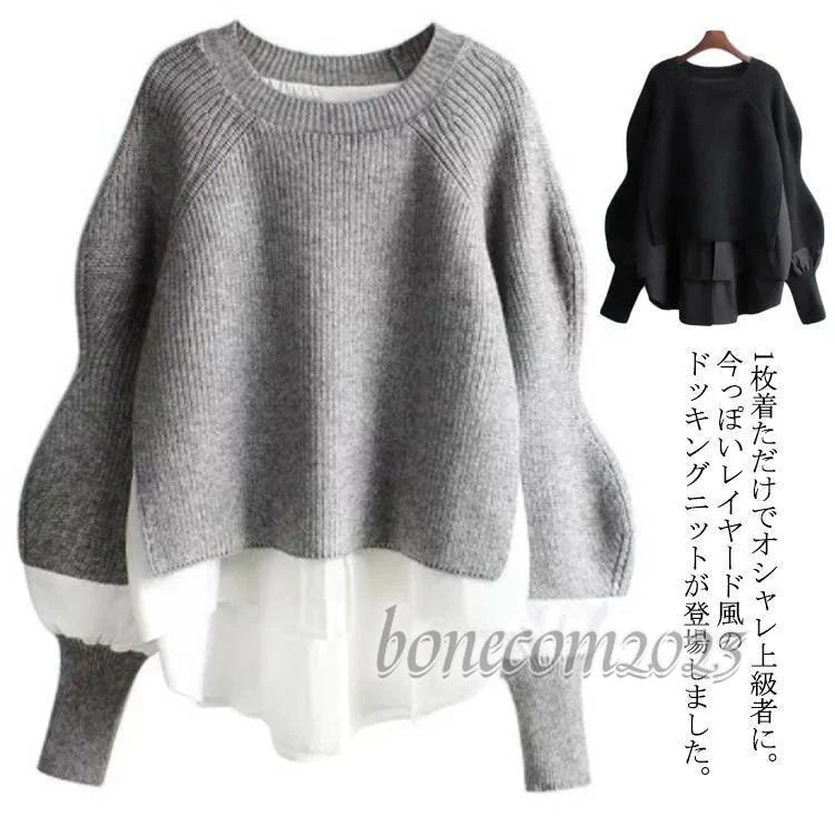 ゆったり セーター ニット ふんわり プルオーバ ブラウス バルーンスリーブ レディース クルーネック 長袖 ニットドッキング バルーン袖 レイヤード風 重ね着風