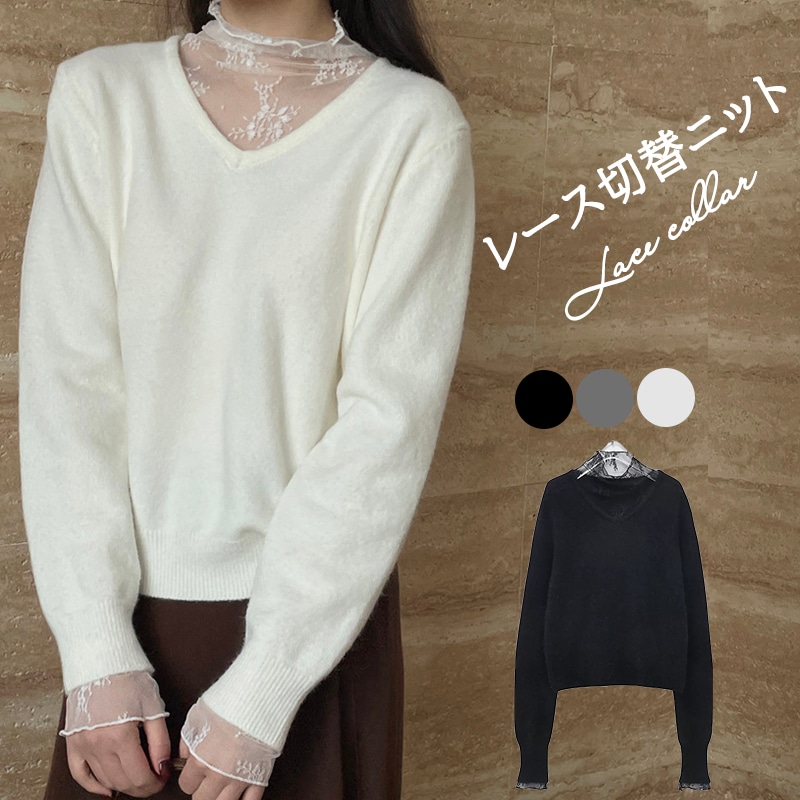 ニット レディース レース切り替え トップス レースネック カットソー ベーシック レース袖裾 長袖 コットン 柔らかい 着痩せ 女性らしい 暖かい 上品 大人 春 秋 柔らかい カシミアタッチ 通勤