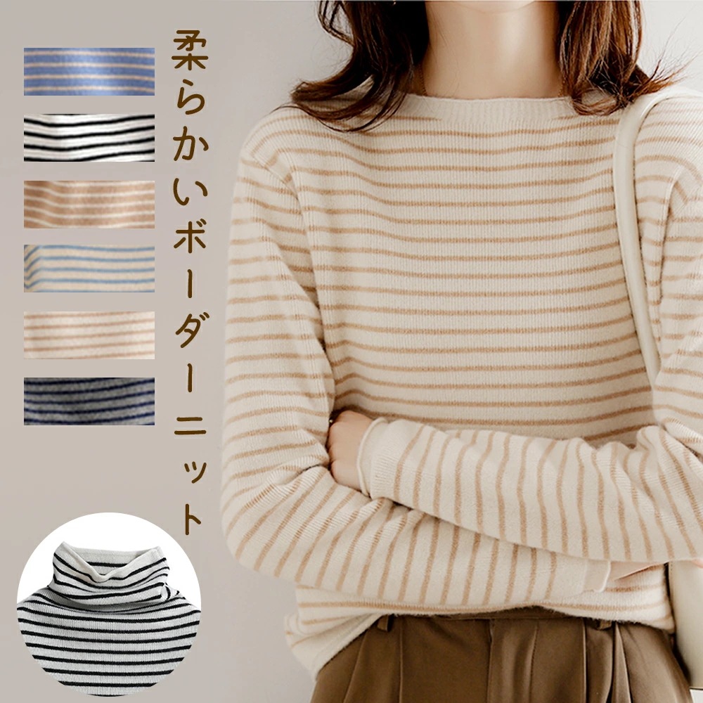 ニット セーター 2タイプネック ボートネック ハイネック タートルネック レディース ボーダー 長袖トップス 秋冬ニットセーター 薄手 防寒 着痩せ カジュアル
