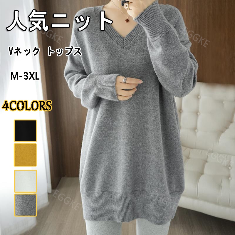 ベーシックニット人気なリブニットゆったりスウェット韓国ファッション カシミヤタッチ ニット Vネック トップス セミロング丈 トップス ニット ベーシックニット トップス ベーシックニット