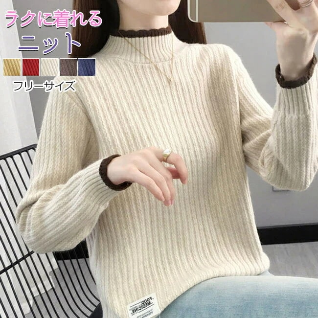 レディース ニットセーター リブニット ストレッチ プチハイネック 長袖 トップス リブ ハイネック 通勤 伸縮性 セーター ニット
