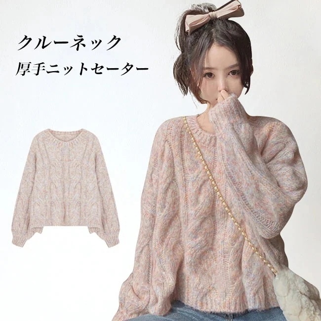 ニットセーター 厚手 ケーブル編み レディース ニット クルーネック 秋冬 ミックスカラー セーター 暖かい 丸首 厚手ニット トップス 長袖 プルーオーバー ラウンドネック レディースニット お洒落