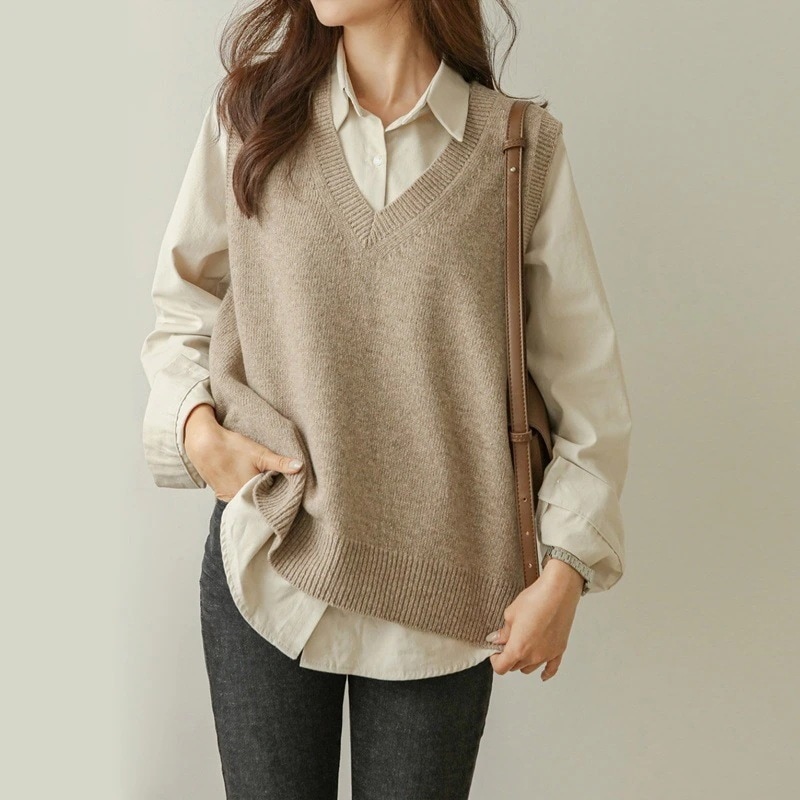 人気なリブニット 韓国ファッション レディースベスト vネック ニット通勤 トップス ノースリーブニットカーディガン 重ね着風 無地 カジュアル