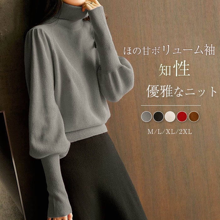 ニットトップス レディース 春 夏 春夏 黒 長袖 セーター ニット パフスリーブ ハイネック 無地 ブラック ベージュ ブラウン ブルー 20代 30代 40代