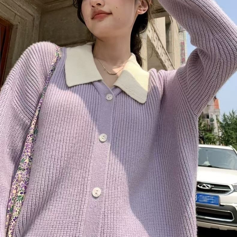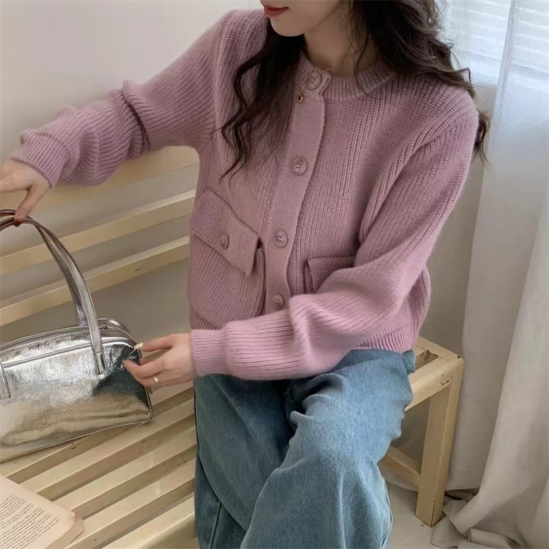 韓国系の怠惰な風の純色ニットカーディガン秋冬の新型レトロで柔らかいモチモチとした丸首セーターの女性コート ニット