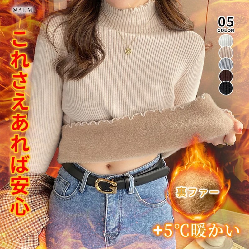 裏起毛 ハイネック ニット セーター トップス 裏ファー レディース リブ フリルネック フリル 長袖 タートルネック 無地 暖かい 厚手 オフィスカジュアル きれいめ 春秋冬 重ね着