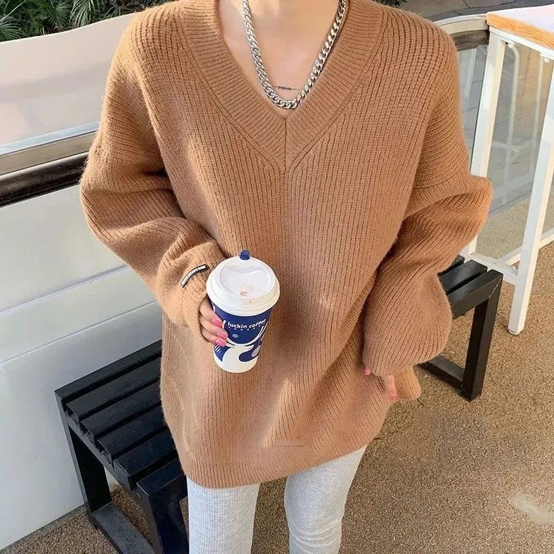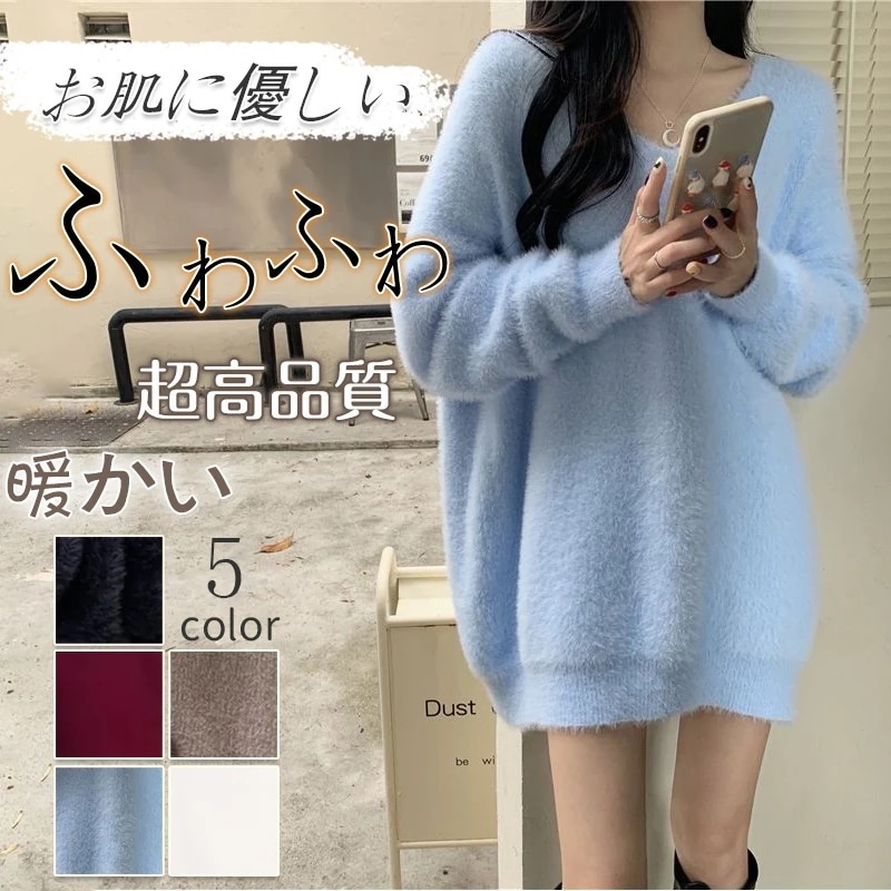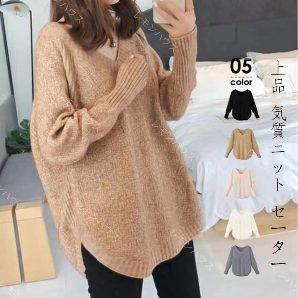 ベーシックニットゆったりスウェット韓国ファッション カシミヤタッチ ニット Vネック トップス セミロング丈 トップス ニット ベーシックニット トップス ベーシックニット