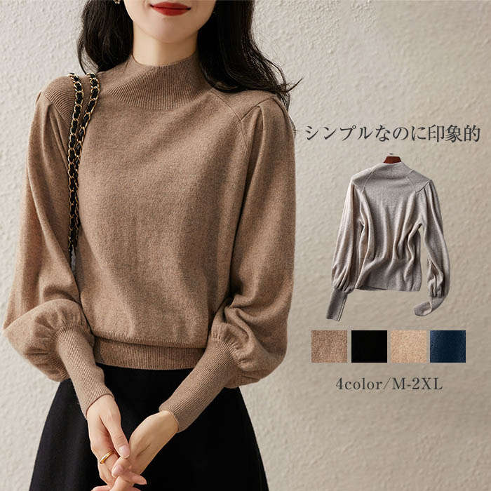 ニットセーター レディース トップス 長袖 秋冬 秋 春 タートルネック バルーンスリーブ バルーン袖 綿 キャメル 無地 シンプル 韓国ファッション 通勤 OL 通学 20代 30代 40代 50代