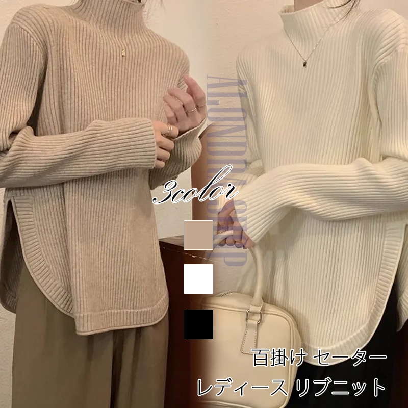 ハイネックインナー レディース ニット ハイネック セーター ニットトップス インナー リブニット ストレッチ デザイン袖口 袖長い ベーシックカラー ニットソー おしゃれ キレイめ 上品 白 黒 ブ